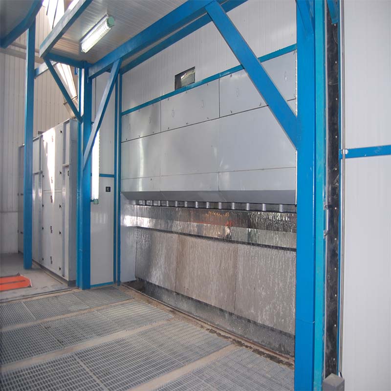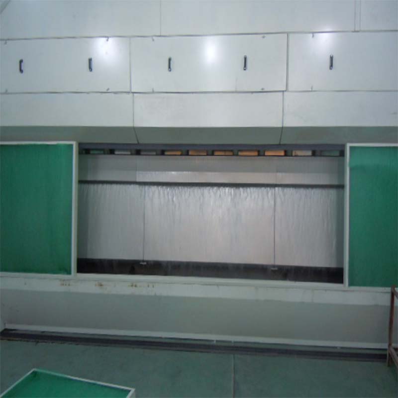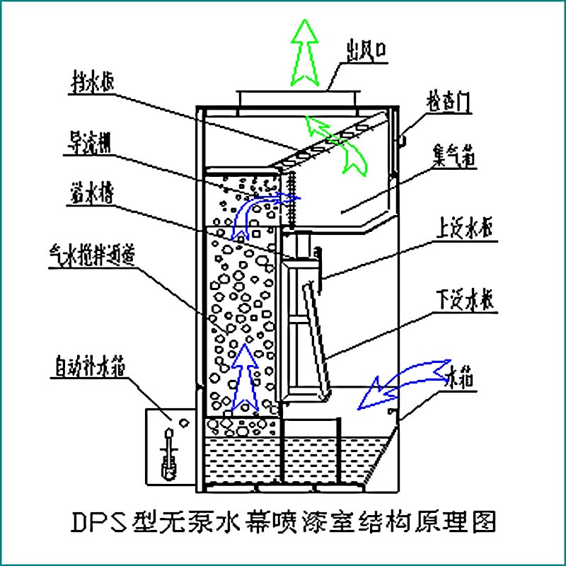 無泵水幕噴漆室在含有漆霧的空氣經(jīng)過前面水簾后進(jìn)行第一次的攔截,隨即進(jìn)入“沸騰攪拌通道”,氣流掠經(jīng)通道下方的水面時由于高速作用將水帶起進(jìn)入通道內(nèi),氣流到達(dá)通道的上方后由于流速的降低,被帶起的水因為重力的作用會有一部分水落回致通道口下方,這樣就會與繼續(xù)帶起的水產(chǎn)生撞擊從而形成沸騰狀,呈沸騰狀的水珠與氣流充分混合攪拌后,顆粒物將被徹底清洗到水中,從而達(dá)到對漆霧顆粒清洗凈化的目的。而被提起的水其中一部分跟隨氣流組織進(jìn)入集氣箱,經(jīng)過分流格柵將空氣與水分離,分離后的凈化空氣由排風(fēng)機(jī)排向室外,分離后的水則沉積在集氣箱底部,匯集到溢水槽后溢流到水幕板上形成循環(huán)水簾,從而有效地除去空氣中的漆霧顆粒,給操作人員以潔凈的工作環(huán)境。